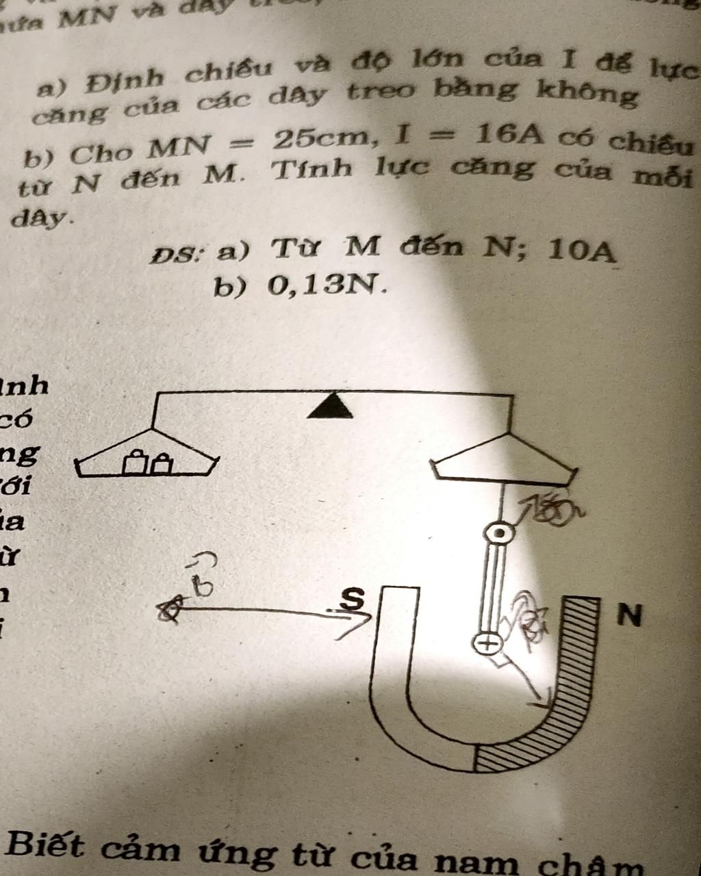 thiết lập thí nghiệm như hình trên, khung dây gồm 100 vòng cạnh a = 5 cm. cho dòng điện I = 5 ampe chạy qua khung dây, ở đĩa cân bên kia đặt quả bơ để cân thăng bằng. sau đó người ta quay nam châm 180 độ để đổi chiều từ trường thì phải thêm vào đĩa cân bên kia bằng 200 gam mới trở lại thăng bằng. tính cảm ứng từ của nam châm