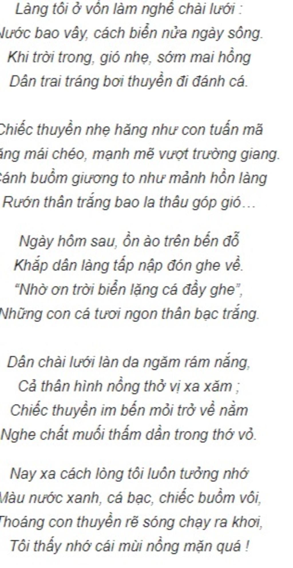 Trả lời : Nội dung chính của bài thơ trên là : Bức tranh thiên nhiên sinh động, nên thơ về một làng quê miền biển, nooit bật trong đó là hình cảnh khoẻ khoắn, đầy sức sống của người dân chài, đó còn là bức tranh về cảnh sinh hoạt, lao động cùng tình cảm quê hương tha thiết, trong sáng của nhà thơ.