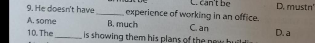 ` -> ` Vì "experience of working" là danh từ không đếm được nên ta dùng "much", đồng thời ta cũng loại câu A vì đây là câu phủ định, danh từ chỉ có thể đi được với "any".
