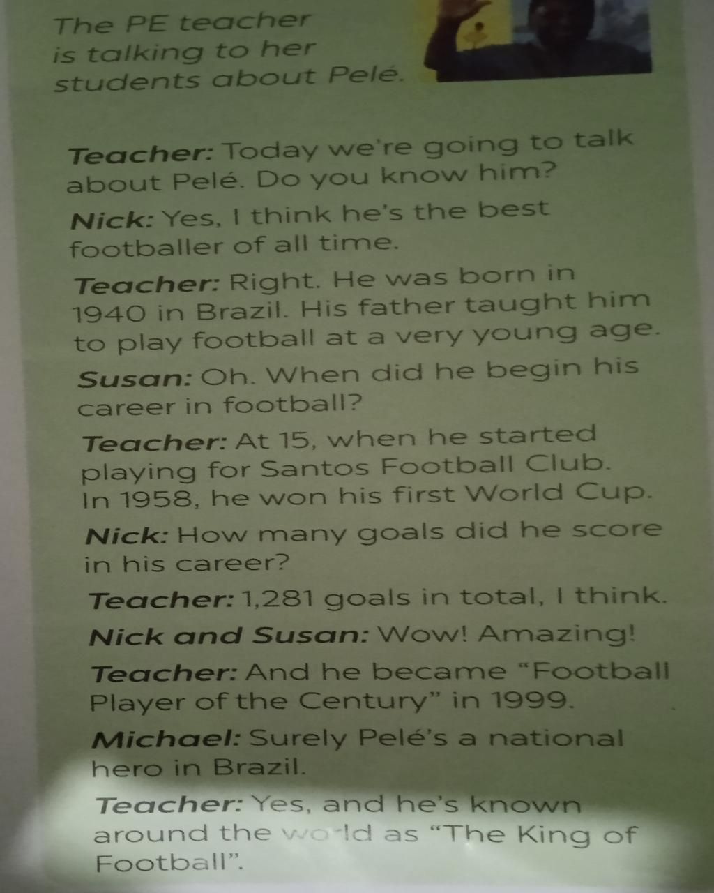 Giáo viên: Đúng vậy. Ông sinh năm 1940 tại Brazil. Bố ông đã dạy ông chơi bóng từ khi còn rất nhỏ.