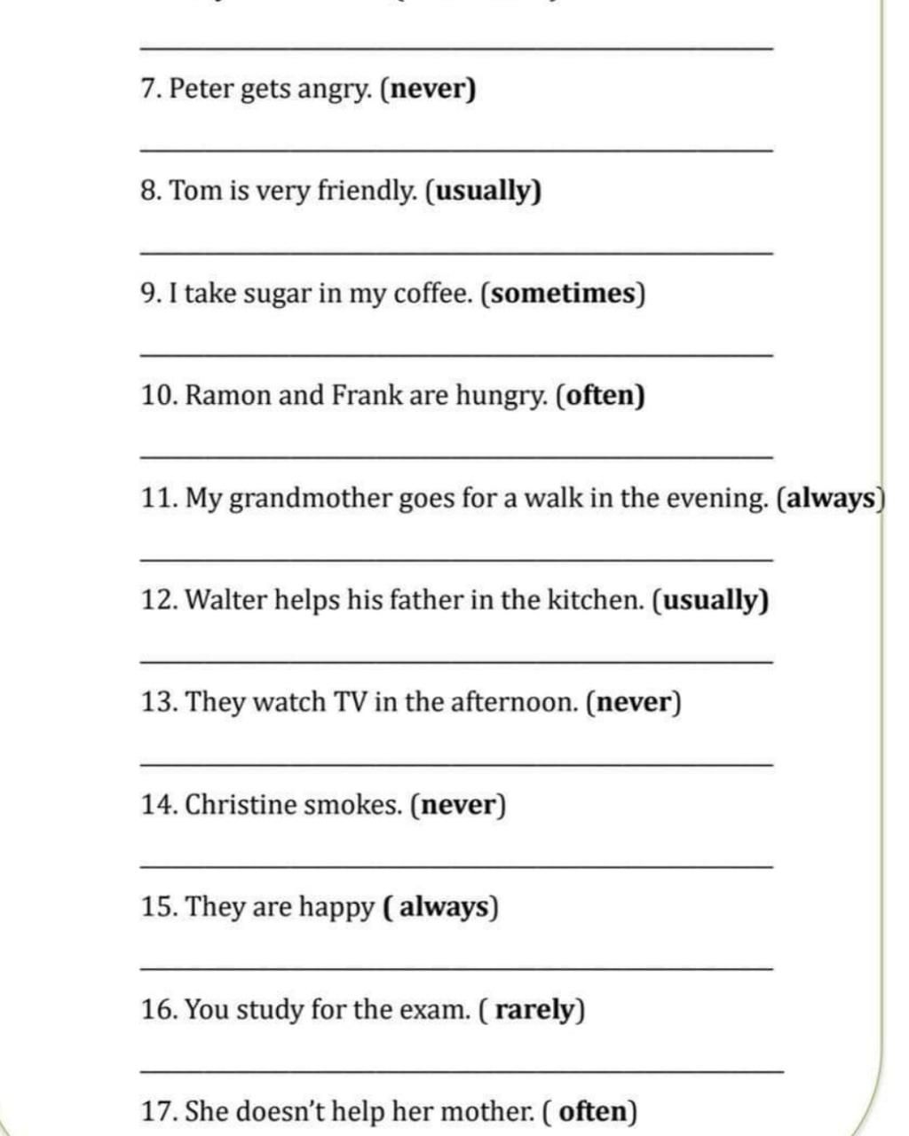 7. Peter gets angry. (never) 8. Tom is very friendly. (usually) 9. I take sugar in my coffee. (sometimes) 10. Ramon and Frank are hungry. (often) 11. My grandmother goes for a walk in the evening. (always) 12. Walter helps his father in the kitchen. (usually) 13. They watch TV in the afternoon. (never) 14. Christine smokes. (never) 15. They are happy ( always) 16. You study for the exam. ( rarely) 17. She doesn't help her mother. ( often)