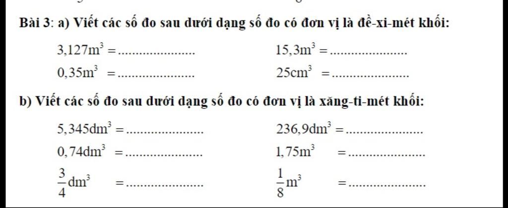 Bài 3 Viết các số đo sau dưới dạng số đó có đơn vị là đề xi mét khối.