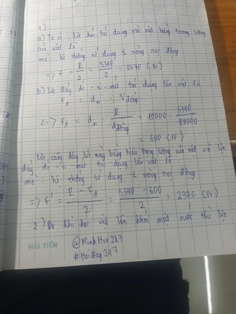 Lực căng dây lúc này bằng hiệu của trọng lượng vật và lực đẩy Ác-si-mét, như vậy với hệ thống này thì lực kéo ở đầu dây là: