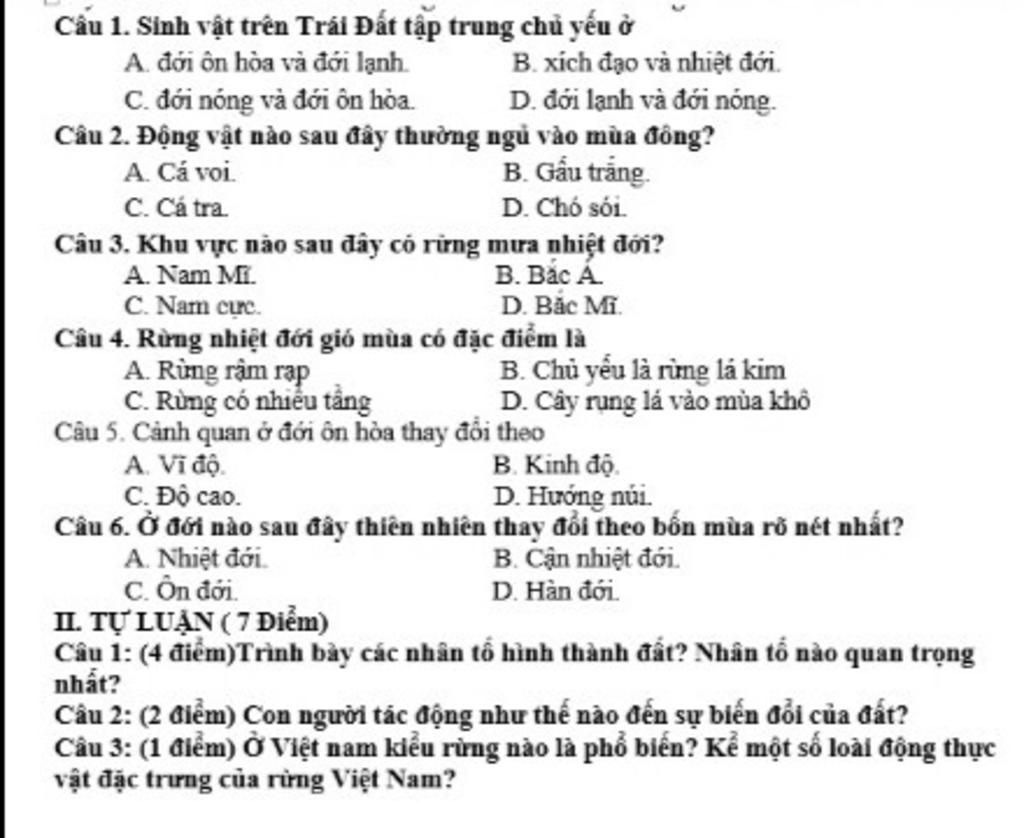 Câu $1$ : Sinh vật trên trái đất tập trung chủ yếu ở: