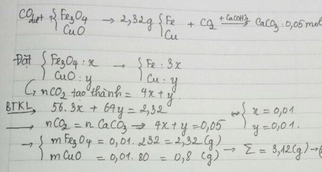thổi một luồng khí CO dư đi qua ống sử đựng hỗn hợp hai oxit Fe3O4 và CuO nung nóng dến khi phản ứng xảy ra hoàn toàn thu được 2,32gam hỗn hợp kim loại . khí thoát ra đưa vào bình đựng dung dịch Ca(OH)2 dư thấy có 5 gam kết tủa trắng . tính khối lượng hỗn hợp hai oxit kim loại ban đầu ?