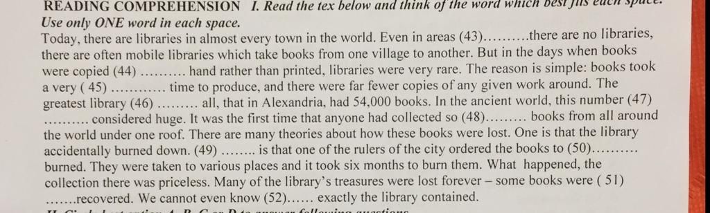 READING COMPREHENSION I. Read the tex below and think of the word which bes