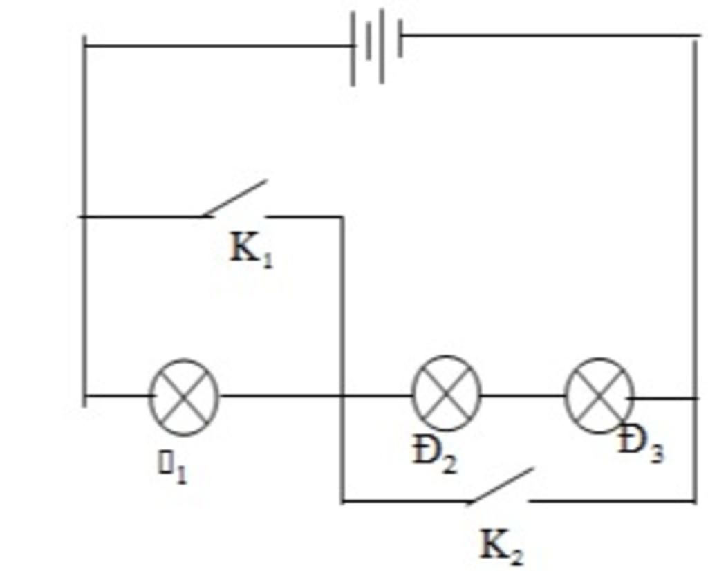 c) K1 đóng, K2 mở thì đèn 1 tắt, đèn 2,3 sáng