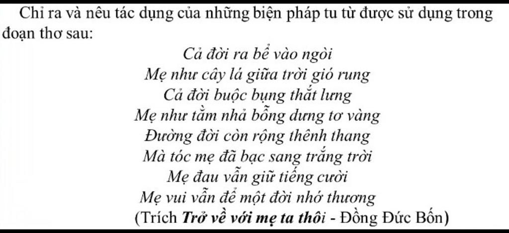 `-` Tác dụng của BPTT: Nhấn mạnh nỗi vất vả của người mẹ cả đời lo cho con mà không màng sức. Bên cạnh đó, biện pháp tu từ so sánh còn giúp cho câu thơ trở nên bay bổng và cuốn hút hơn, để cho người đọc dễ dàng hình dung ra được hình ảnh cuộc đời người mẹ. Vì lo cho con mà quên mình, chứng tỏ người mẹ rất yêu thương con mình. ''Mẹ như cây lá giữa trời gió rung'' chỉ gian nan mà mẹ đã trải qua. ''Mà tóc mẹ đã bạc sang trắng trời'' chỉ thời gian đã làm cho tóc mẹ ngả màu bạc trắng. ''Mẹ đau vẫn giữ tiếng cười, mẹ vui vẫn để một đời nhớ thương'' chỉ sức chịu đựng của mẹ rất kiên cường và vững vàng, sẵn sàng vì ocn mình mà hi sinh tất cả.