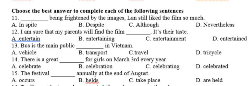 => cấu trúc:Despite/In spite of + Noun/Noun Phrase/V-ing, S + V