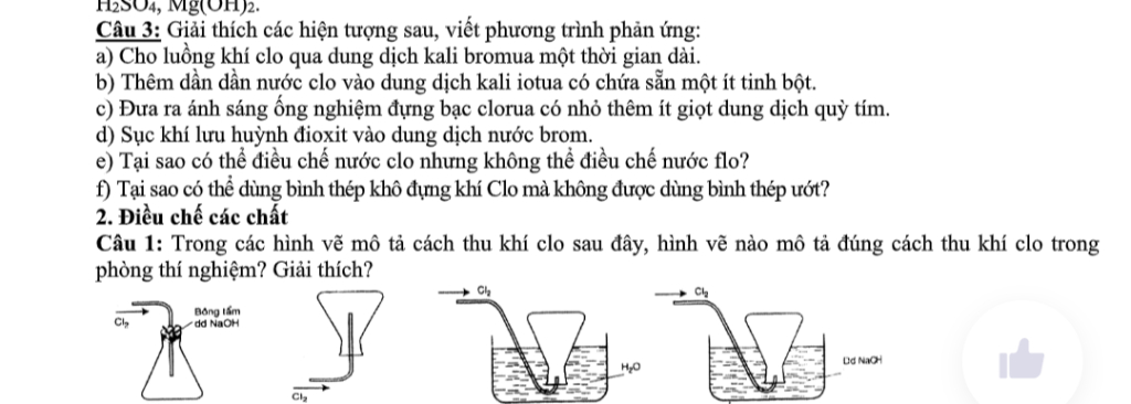 Câu 1: Hình thứ nhất mô tả cách thu khí clo (hình này có trong phần điều chế khí clo). Vì khí clo nặng hơn không khí.