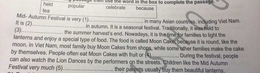 Mid-Autumn Festival is very `(1)` popular in many Asian countries, including Viet Nam. It is `(2)` held in autumn. It is a seasonal festival. Traditionally, it was held to `(3)` celebrate the summer harvest's end. Nowadays, it is the time for families to light the lanterns and enjoy a special type of food. The food is called Moon Cake, because it is round, like the moon. In Viet Nam, most families buy Moon Cakes from shops, while some other families make the cakes by themselves. People often eat Moon Cakes with fruits or `(4)` tea. During the festival, people can also watch the Lion Dances by the performers on the streets. Children like the Mid-Autumn Festival very much `(5)` because their parents usually buy them beautiful lanterns.