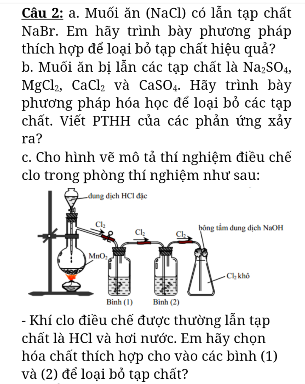 - Bình (1) chứa $NaCl$ bão hòa để hấp thụ $HCl$ bay hơi ra.