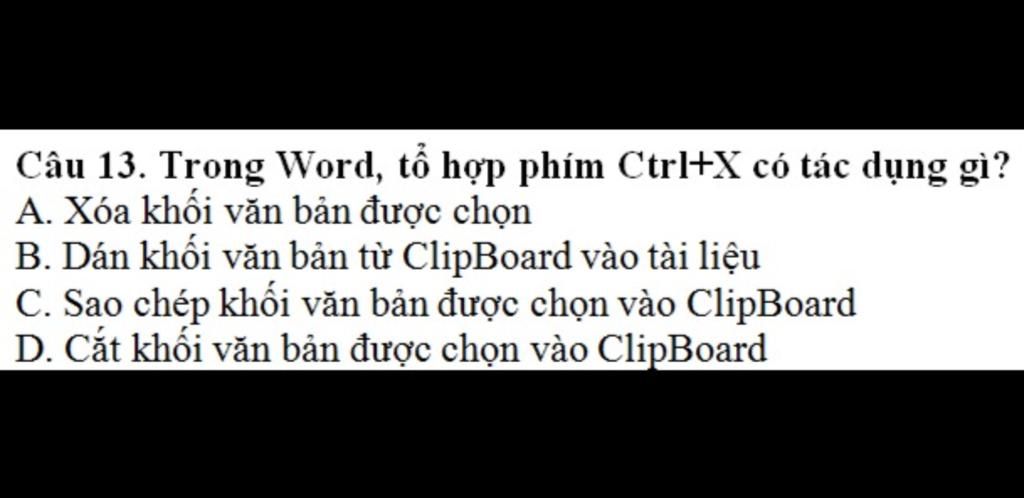 Câu 13. Trong Word, tổ hợp phím Ctrl+X có tác dụng gì?