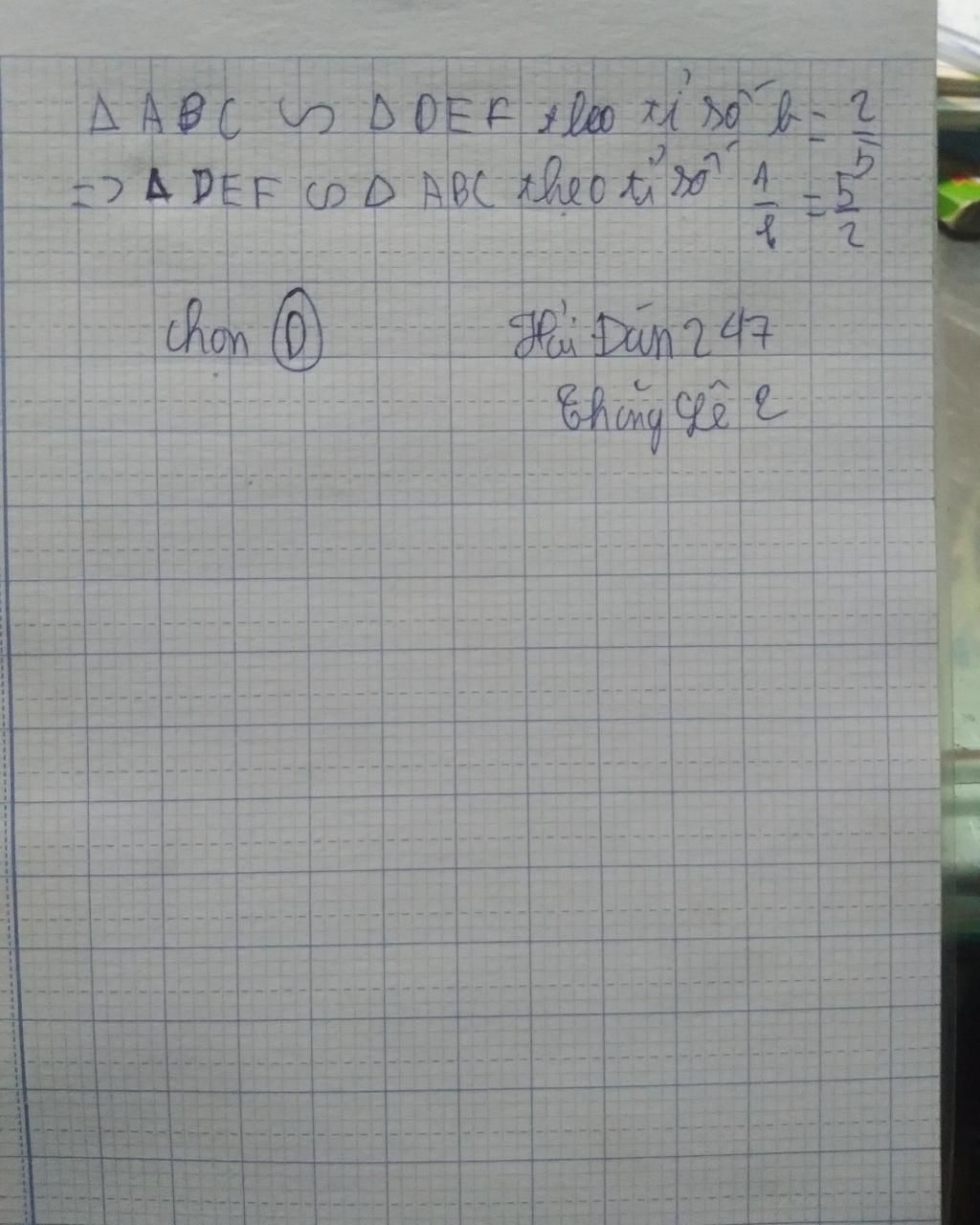 `ΔABC` đồng dạng với `ΔDEF` theo tỉ số đồng dạng `k = 2/5 `