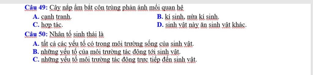 50. Nhân tố sinh thái là những yếu tố của môi trường tác động tới sinh vật.