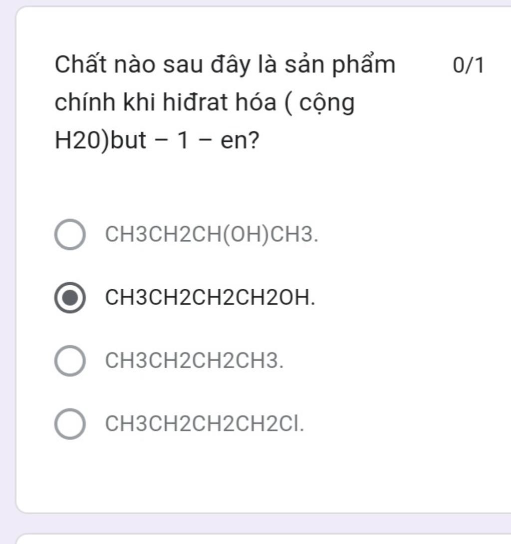 \(C{H_2} = CH - C{H_2} - C{H_3} + {H_2}O\xrightarrow{{{H^ + }}}C{H_3} - CHOH - C{H_2} - C{H_3}\)