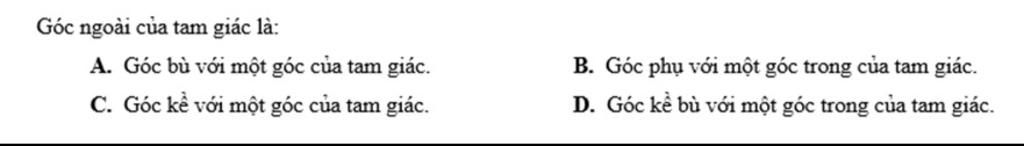 $+$ Mỗi góc ngoài tam giác có số đo bằng tổng số đo hai góc trong không kề với nó