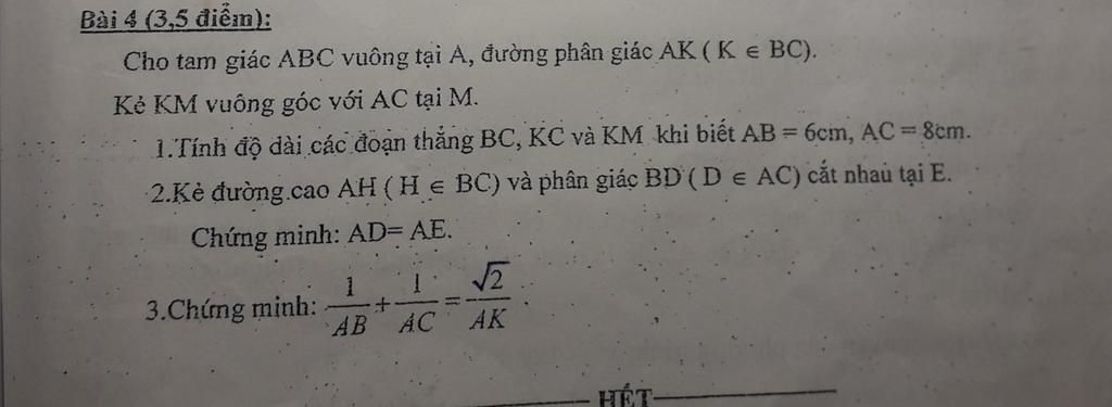 Cho tam giác ABC vuông tại A, đường phân giác AK ( K e BC).