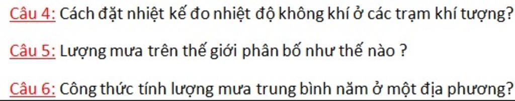 Câu 4:-Nhiệt kế đc đặt trong lều khí tượng sơn màu trắng,cách mặt đất 1,5m.Nhiệt độ không khí đc đo ít nhất 4 trong ngày.