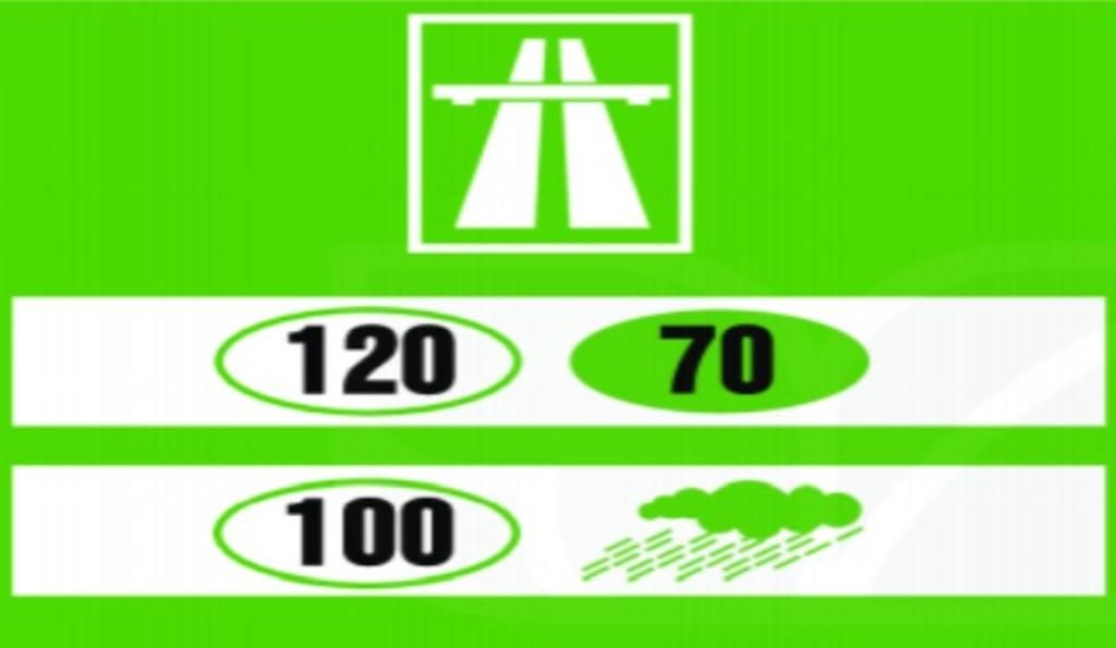 * Biển báo có số 100 - và hình mưa :Biển báo tốc độ tối đa khi trời mưa là 100km/h.