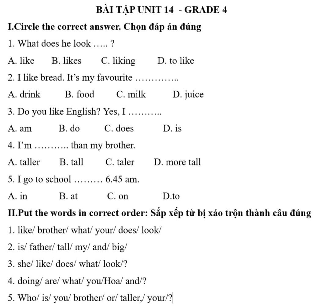1. What does your brother look like ? 2. My father is tall and big ? 3.What does she look like ? 4 What are you and Hoa doing? 5. Who is your brother taller , or you ?