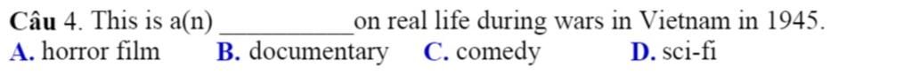 `-` cuộc sống trong chiến tranh ở Việt Nam năm 1945 `->` documentary: phim tài liệu