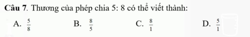 Thương của phép chia 5 : 8 có thể viết thành $\frac{5}{8}$