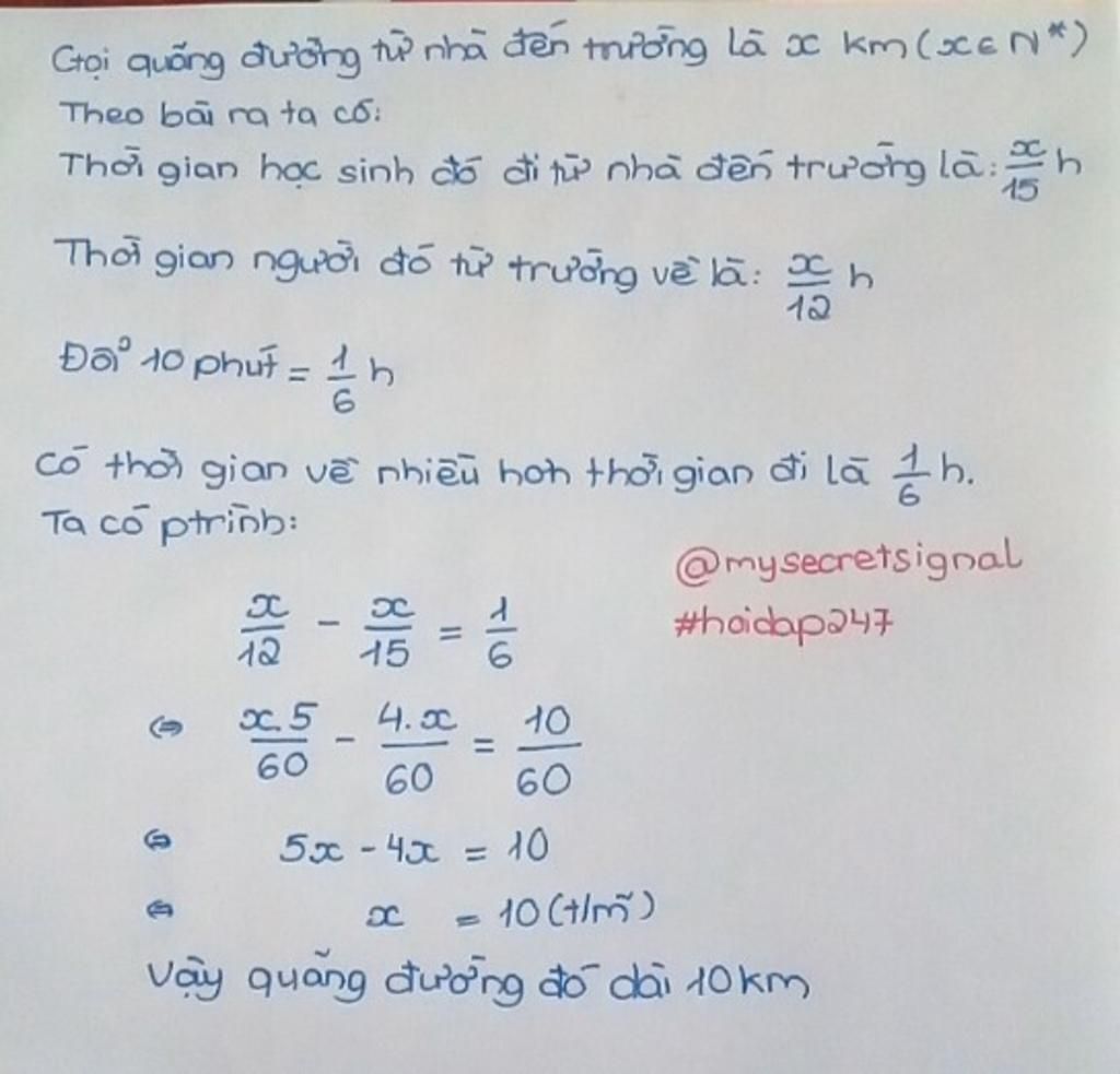 Học sinh đó đi từ trường về nhà với vận tốc `12`km/h thì có thời gian di chuyển là `x/12` h