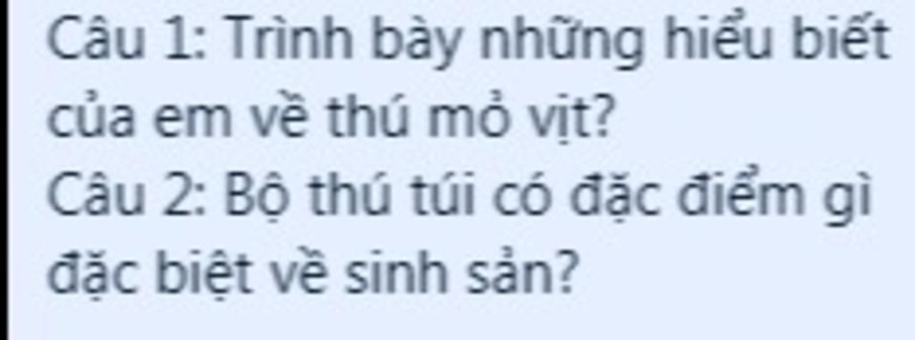 Thú mỏ vịt có mỏ dẹp , bộ lông rậm , mịn , không thấm nước , chân có những màng bơi , thú mỏ vịt đẻ trứng , thú mõ vịt con ép mỏ vào bụng thú mẹ cho sữa chảy ra , Sau đó chúng liếm lông , lấy sữa vào mỏ . Thú mỏ vit con bơi theo mẹ, uống sữa do thú mẹ tiết ra hòa lẫn trong nước.