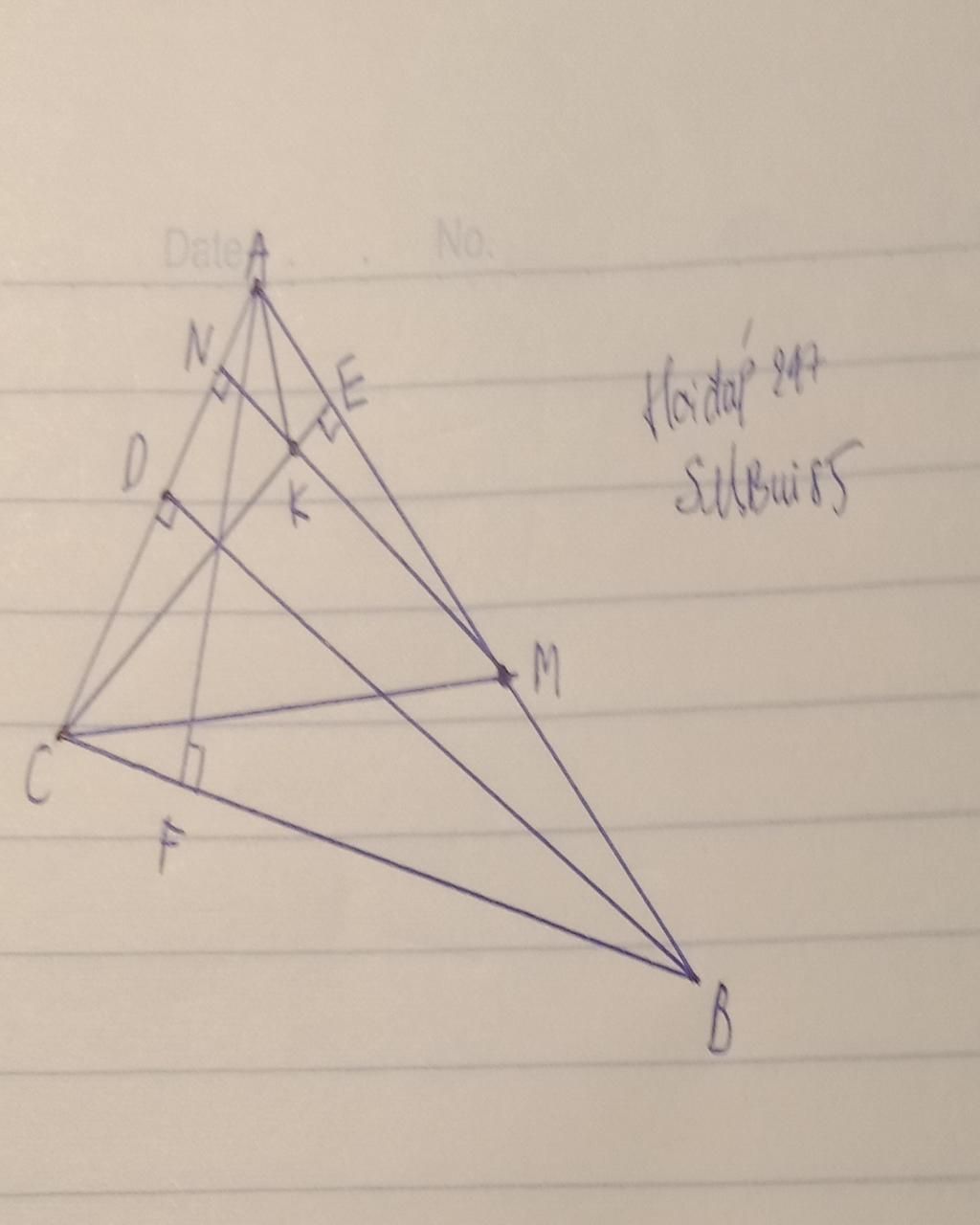 Cho tam giác nhọn ABC có AB > AC, ba đường cao BD,CE và AF cắt nhau tại H. Lấy điểm M trên cạnh AB sao cho AM = AC. Gọi N là hình chiếu của M trên AC ; K là giao điểm của MN và CE.