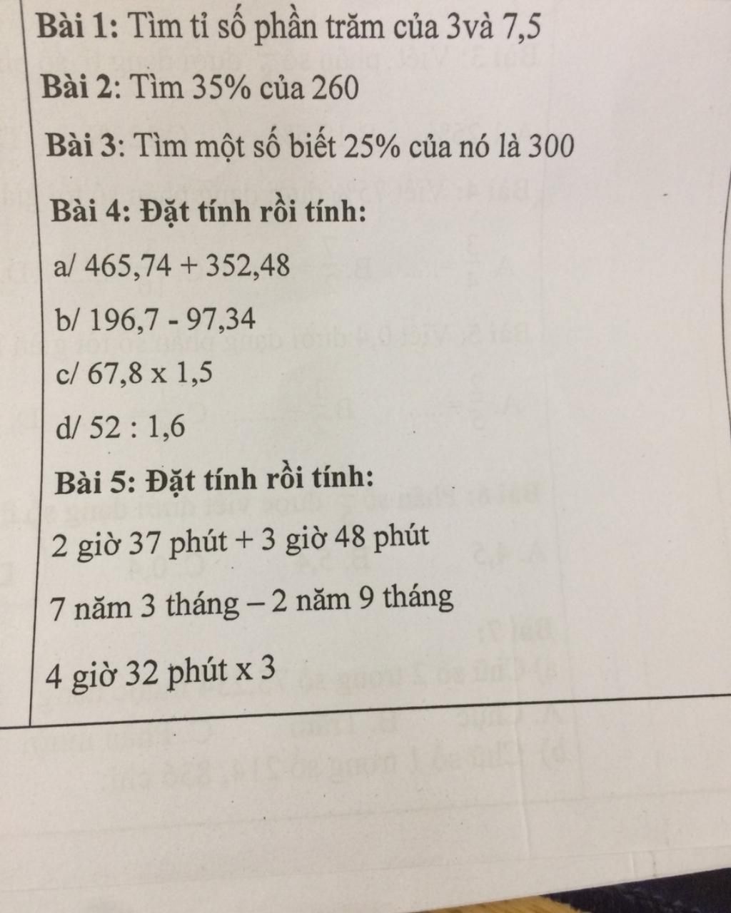 Bài 1:Tỉ số phần trăm của 3 và 7,5 là 40