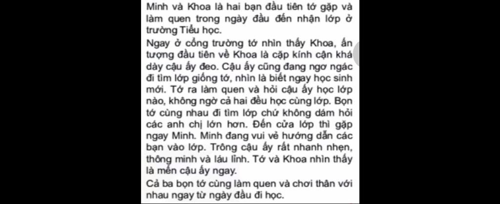 Ngay ở cổng trường tớ nhìn thấy Khoa, ấn tượng đầu tiên về Khoa là cặp kính cận khá dày cậu ấy đeo. Cậu ấy cũng đang ngơ ngác đi tìm lớp giống tớ, nhìn là biết ngay học sinh mới. Tớ ra làm quen và hỏi cậu ấy học lớp nào, không ngờ cả hai đều học cùng lớp. Bọn tớ cùng nhau đi tìm lớp chứ không dám hỏi các anh chị lớn hơn. Đến cửa lớp thì gặp ngay Minh. Minh đang vui vẻ hướng dẫn các bạn vào lớp. Trông cậu ấy rất nhanh nhẹn, thông minh và láu lỉnh. Tớ và Khoa nhìn thấy là mến cậu ấy ngay,