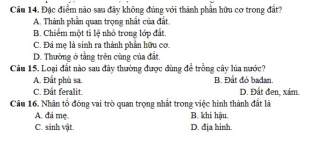 Câu 14. Đặc điểm nào sau đây không đúng với thành phần hữu cơ trong đất?