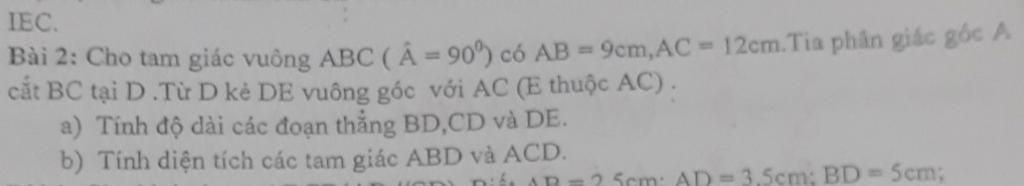 Bài 2: Cho tam giác vuông ABC (Â = 90°) có AB = 9cm, AC -12cm.Tia phân giác góc A