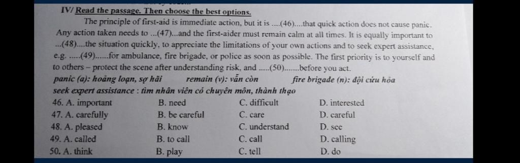 IV/ Read the passage. Then choose the best options. The principle of first-aid is immediate action, but it is (46) that quick action does not cause panic.