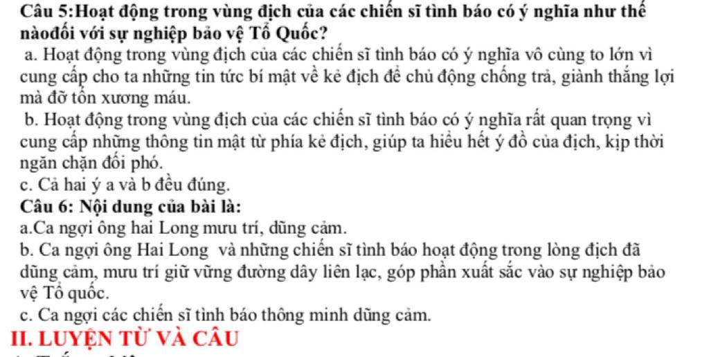 Không chọn A vì ngoài chiến trường gian khổ còn bao người tình báo đang hi sinh thầm lặng cho tổ quốc. Không chọn C vì nội dung ấy không nhắc đến Hai Long - nhân vật chính trong chuyện. Ngoài ra, ý b cũng là ý chứa đầy đủ nội dung nhất.