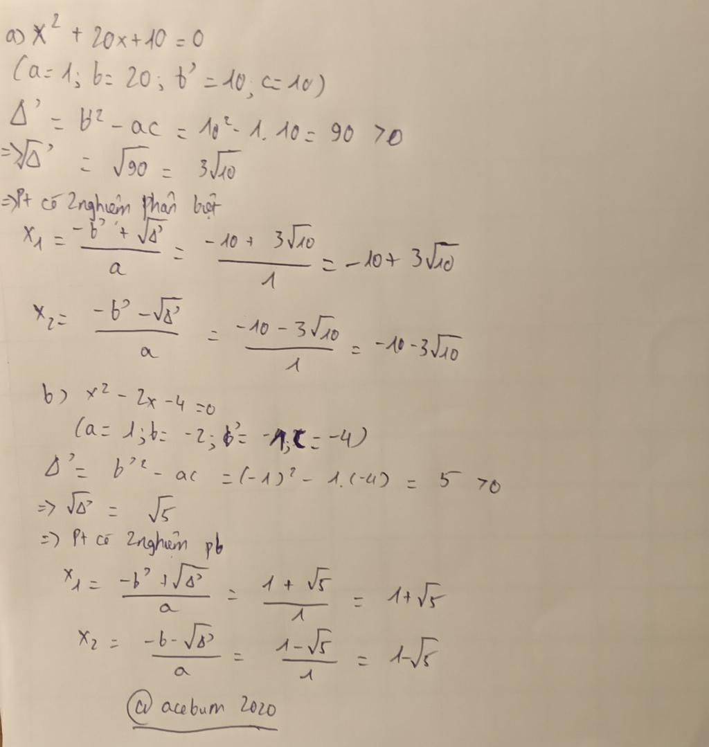 `x=(−(20)±\sqrt{20^2-4.1.10})/(2.1)`
