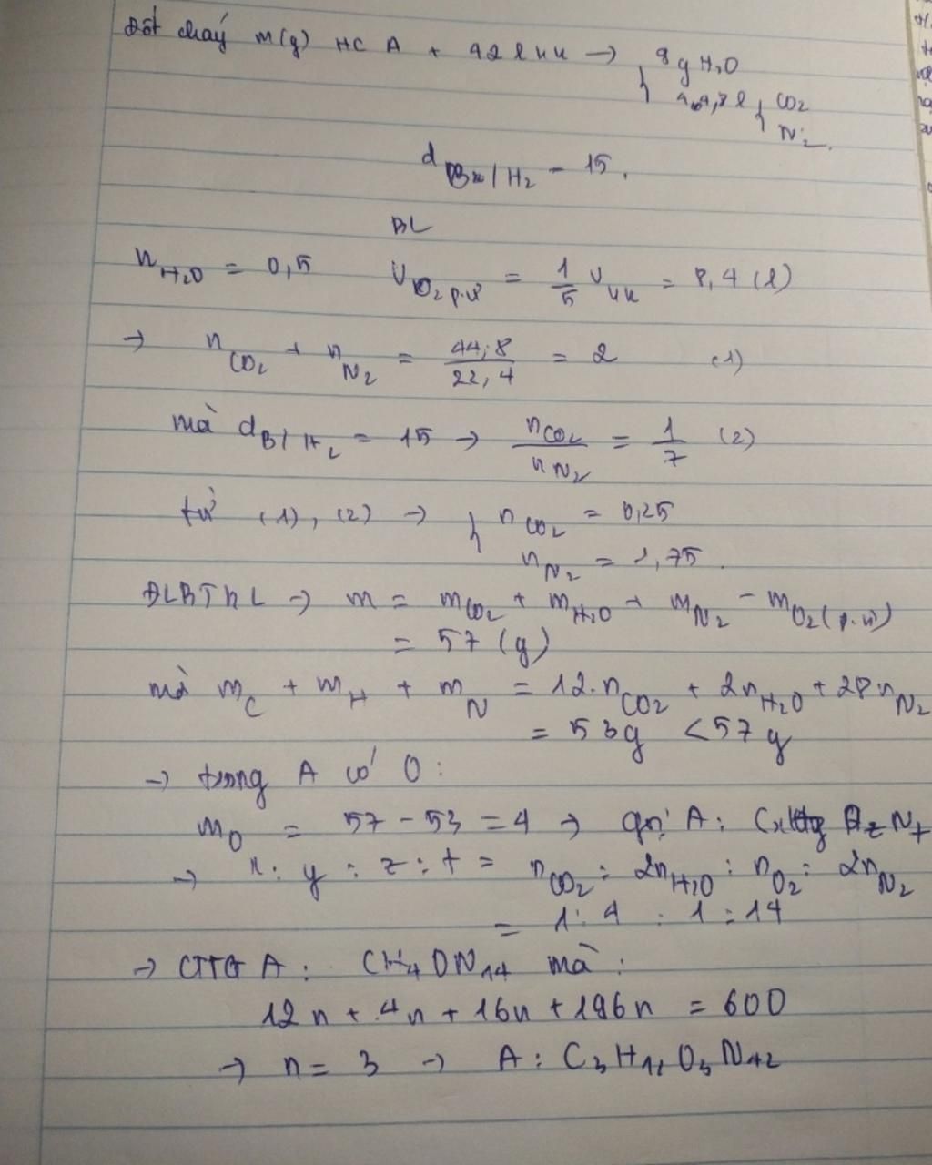 Đốt cháy hoàn toàn m gam hợp chất A cần vừa dù 42 lít không khí. Sau phản ứng thu được 9 gam nước và 44,8 lit hon hop khí B gồm CO2 và N2. Biết d 15 (các khí đo ở dktc, không khí có 20% %3D O2 và 80% N2 theo thể tích). Tính m và xác định công thức hóa học của A? Biết MA= 60 (g/mol).