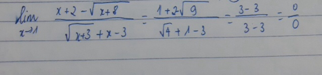 \(lim_{x \rightarrow 1} \frac{x+2-\sqrt{x+8}}{\sqrt{x+3}+x-3}=lim_{x \rightarrow 1} \frac{[(x+2)^{2}-x-8][\sqrt{x+3}-(x-3)]}{[x+3-(x-3)^{2}][x+2+\sqrt{x+8}]}=lim_{x \rightarrow 1}\frac{(x^{2}+3x-4)[\sqrt{x+3}-(x-3)]}{(-x^{2}+7x-6)[[x+2+\sqrt{x+8}]}=lim_{x \rightarrow 1} \frac{(x-1)(x+4)[\sqrt{x+3}-(x-3)]}{(x-6)(x-1)[x+2+\sqrt{x+8}]}=lim_{x \rightarrow 1}\frac{(x+4)[\sqrt{x+3}-(x-3)]}{(x-6)[x+2+\sqrt{x+8}]}=lim_{x \rightarrow 1}\frac{(1+4)[\sqrt{1+3}-(1-3)]}{(1-6)[1+2+\sqrt{1+8}]}=\frac{-2}{3}\)