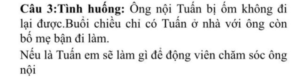 Nếu là Tuấn để động viên chăm sóc ông nội em sẽ trò chuyện cùng ông, để ông bớt buồn. Em sẽ đi rót nước mời ông uống, lấy hoa quả mời ông ăn. Em sẽ hỏi ông cần gì, để đi lấy giúp ông…
