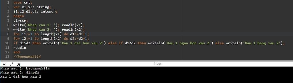 if d1>d2 then writeln('Xau 1 dai hon xau 2') else if d1<d2 then writeln('Xau 1 ngan hon xau 2') else writeln('Xau 1 bang xau 2');