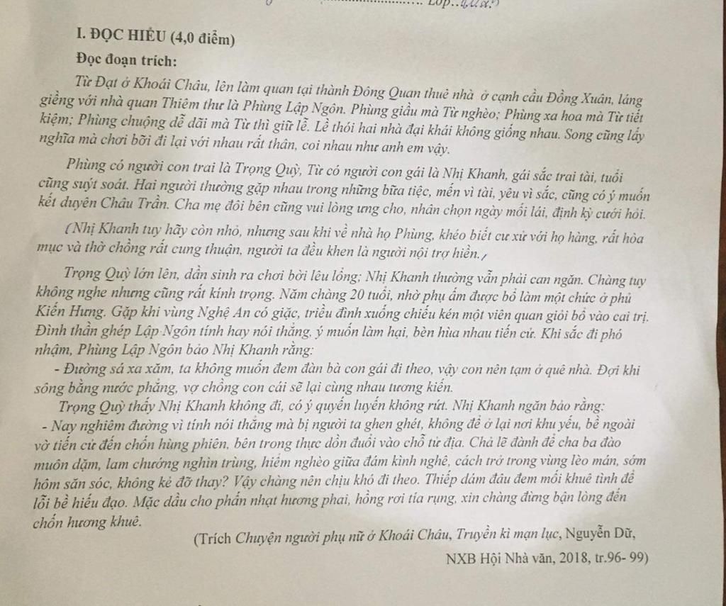 I. ĐỌC HIỂU (4,0 điểm)