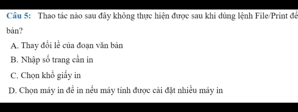 Thao tác nào sau đây không thực hiện được sau khi dùng lệnh File/Print để in văn bản?