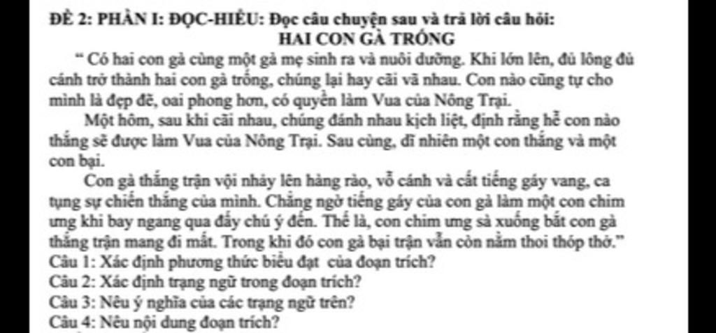 Câu 4: Nội dung: Câu chuyện về sự ghen ghét, đố kị, ích của hai con gà trống vốn là anh em với nhau, đồng thời là bài học về tình cảm anh em trong gia đình. Là anh em trong gia đình phải biết yêu thương, đùm bọc, nương tựa lẫn nhau, phải biết dựa vào nhau mà sống, đừng vì một chút lòng riêng mà ghen ghét, đố kị lẫn nhau.