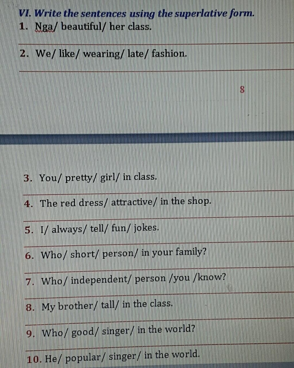 Nè bạn 1. Nga is the most beautiful in her class. 2. We like wearing the latest fashion. 3. You are the prettiest girl in class. 4. The red dress is the most attractive in the shop. 5. I always tell the funniest jokes. 6. Who is the shortest person in your family? 7. Who is the most independent person you know? 8. My brother is the tallest in the class. 9. Who is the best singer in the world? 10. He is the most popular singer in the world. Rút gọnNè bạn 1. Nga is the most beautiful in her class. 2. We like wearing the latest fashion. 3. You are the pretti... xem thêm