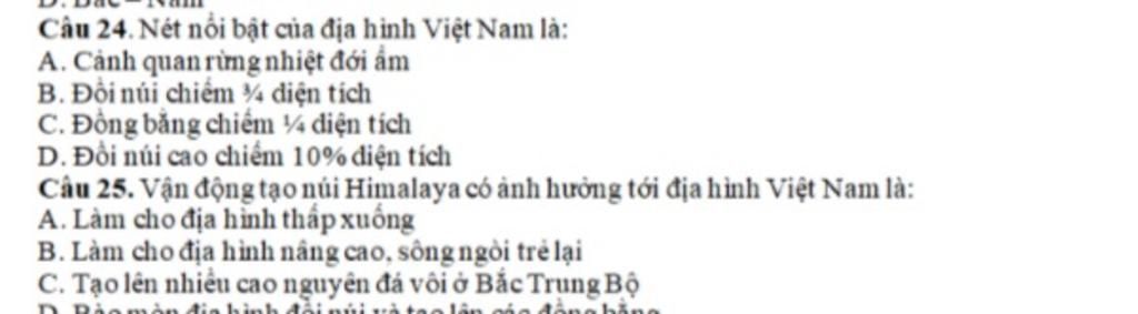 Câu 24 : B , Đồi núi chiếm 3/4 diện tích