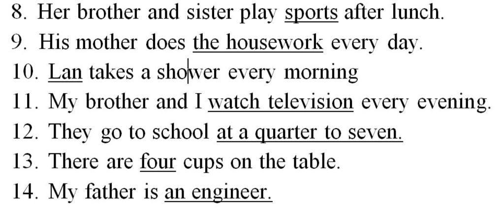 `-`Vì phần được gạch chân là "the housework" nên ta hỏi bằng What ( Cái gì ? )