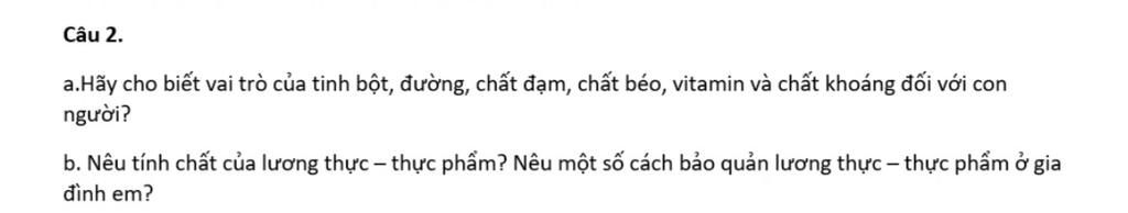 a) Vai trò của chất tinh bột, đường, chất đạm, chất béo, vitamin và chất khoáng đối với con người là :