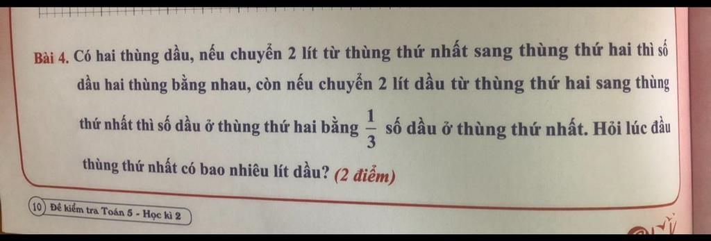 Bài 4. Có hai thùng dầu, nếu chuyển 2 lít từ thùng thứ nhất sang thùng thứ hai thì số