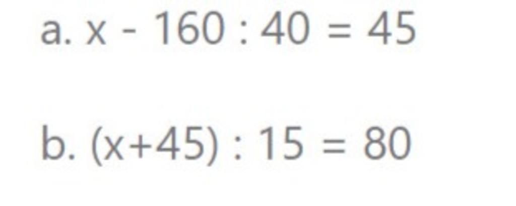 `b) (x+45) : 15 = 80`